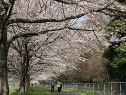 東縁には坂東桜といわれた桜並木があり、春には花見客で大いに賑わいました。しかし、第二次大戦後の物不足時に薪として切倒されてしまいました。その後、桜並木を復活させたいという有志の努力が実り、平成元年「平成桜」として見事な桜並木が復活しました。