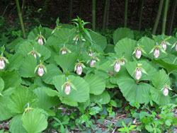 4月中旬から5月上旬の開花時、有料にて紅紫色のクマガイソウが楽しめます。網目状のスジが走る袋状の花で、近年、環境の変化によって絶滅に近い状態になってきている。